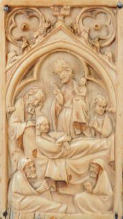 Death of the Virgin (Dormition); Christ holding the soul of the Virgin; apostles.