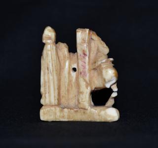 Partially carved in the round; vertical axis in the centre where the piece must have been attached to a surface. Traces of purple pen inscription, not legible.