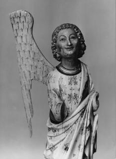 The angels, looking up, would have been placed slightly lower than the central coronation group (OA 58), as their posture makes clear. It would have been integrated in an architectural setting. The group may have included more figures, including two angels now at the Mayer van den Bergh in Antwerp. See related objects.