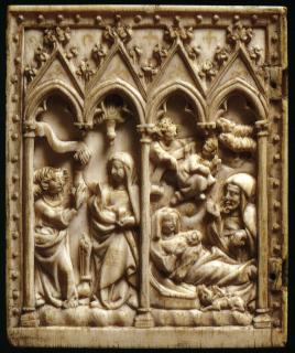 Annunciation; vase of lilies; dove of the Holy Spirit. Nativity (Virgo Lactans) and Annunciation to the Shepherds.