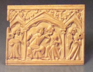 Male musician with string instrument; musical instrument with animal head. Courting couple (meeting of lovers); seated couple; youth chucking his lover under the chin; youth with a hawk on his wrist; lady holding a dog. Female musician with string instrument.