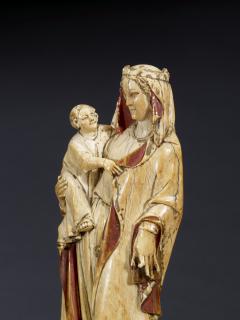 Traces of polychromy and gilding in the hair, veil, and along the hems, red on the lining of the Virgin's cloak.
