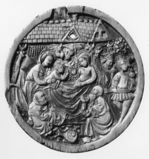 Adoration of the Magi with Joseph; midwife (?).Crosshatched background.