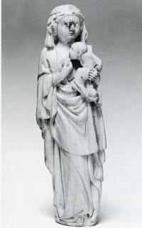Standing Virgin and Child (Virgo lactans); Christ seated on left arm; Christ in long robe.