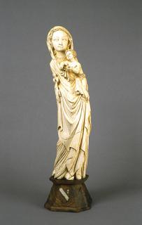 Standing Virgin and Child (Vierge glorieuse); bare-chested Christ; Christ seated on left arm.