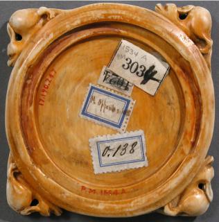 Back turned with a depression for (missing) mirror. Numerous labels with inscriptions: 'M. Oppenheim', 'o. 138', '1024', '3034' and 'P. M. 1534 A'.