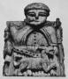 Rook; watchman with his back to a fence, blowing into a horn; dog; flanked by two smaller soldiers with shields.